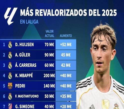 北京时间12月24日,德转列出了2025年身价涨幅最高的15名西甲球员,赫伊森一年时间身价暴涨5200万欧元高居第一,居莱尔上涨4500万欧元第二,阿尔瓦罗-卡雷拉斯上涨4200万欧元第三,姆